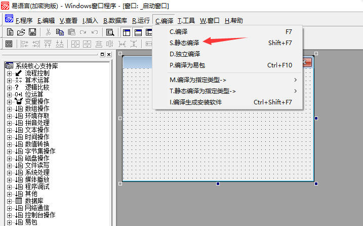 7、 如果您已经购买并且安装好了易语言加密狗,此时打开易语言新建一个空程序,点击“编译”菜单中的“静态编译”,便可以实现静态编译