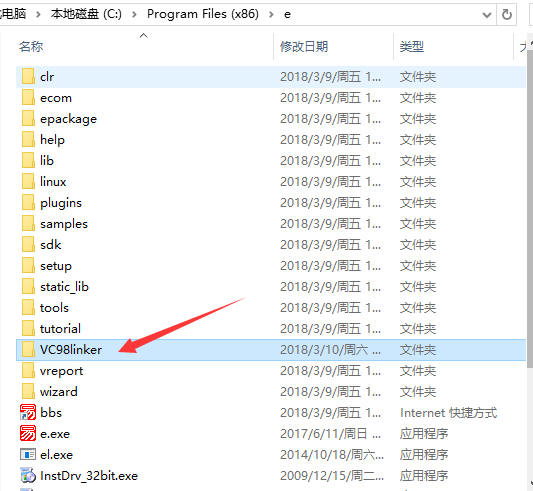 3、复制上图中的“VC98linker”目录,粘贴到易语言安装目录下,如下图