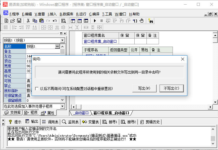 2、点击上图中的“保存”按钮,弹出如下界面,因为普通编译后的EXE文件中不包含支持库文件,所以发给别人运行时候需要连同程序运行需要的支持库文件一并附带,此时易语言会提示是否将这个程序所要用的支持库写出到刚才编译后的文件目录中,此时可以选择“写出”。